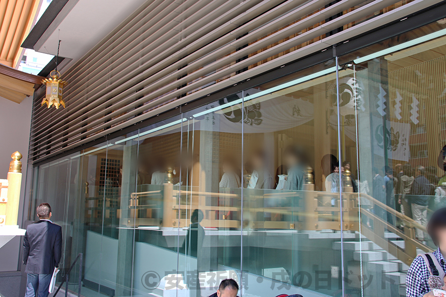 ちなみに水天宮の待合所は、本殿の右手に↑写真のような御祈祷受付から本殿に連なる建物内の回廊があり、その回廊沿いのところに待合室(待合スペース)があります。