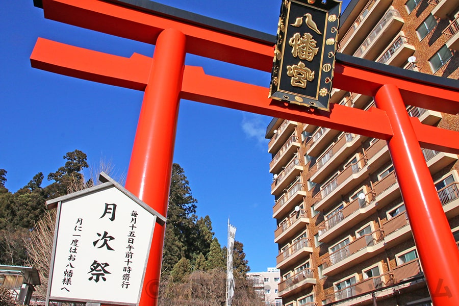写真左奥には同八幡宮の車のお祓い所が見えます。