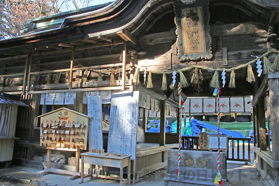 こちらが御社殿前の長床でこちらも国の重要文化財。訪問時は所々改修工事が行われているようでした。