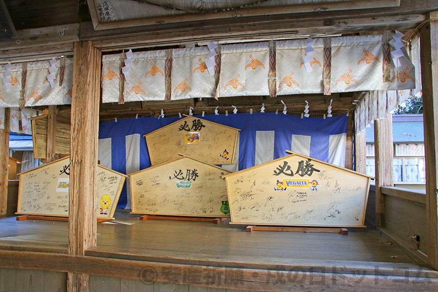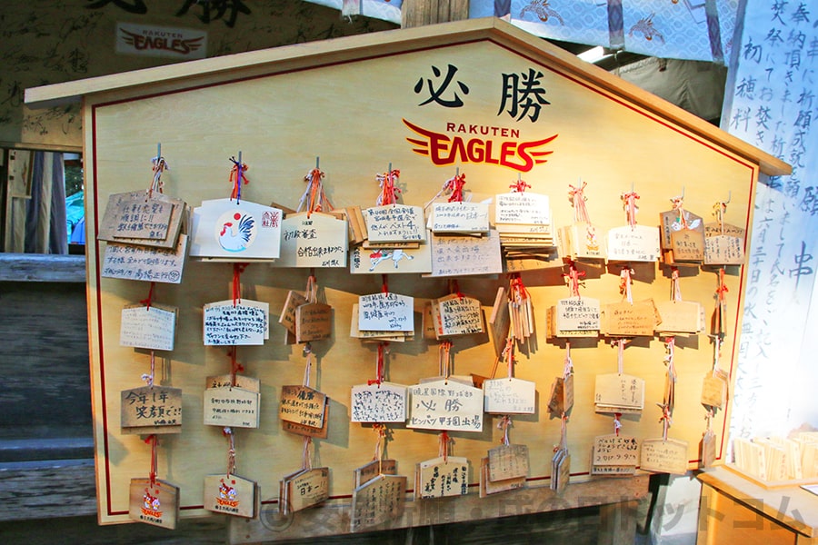 こちらは楽天イーグルスのファン向けの応援絵馬が掛けられている絵馬掛けの様子です。
