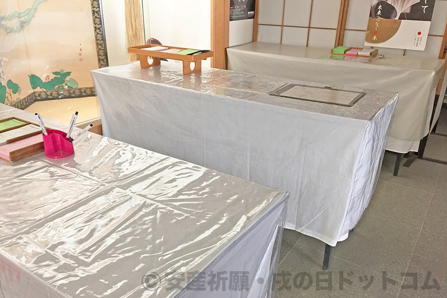 大崎八幡宮 祈願申込記入用の用紙と机の様子