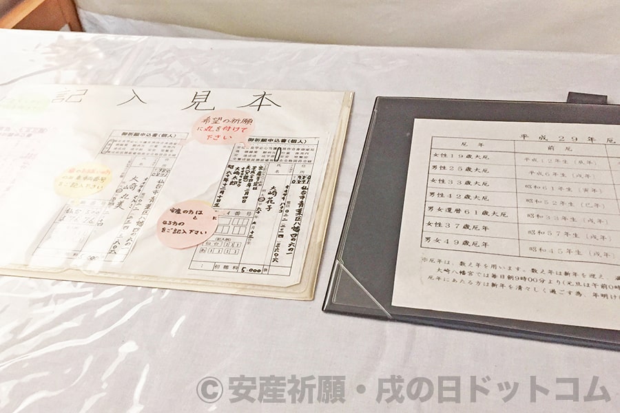 申込書は各机に記入の見本があるので、それにならって記入していきましょう。安産祈願もどの申込用紙に記入するかなど、こちらに案内がありますので、それに従って記入下さい。