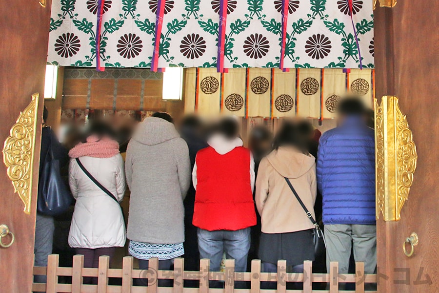 ※写真:冬の時期の大宮氷川神社(埼玉県さいたま市)戌の日の妊婦さんたちの服装の様子(社殿での服装)|撮影:安産祈願・戌の日ドットコム