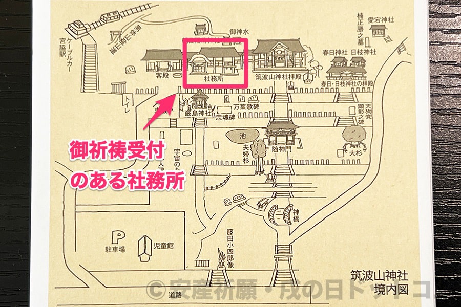 ※筑波山神社 境内案内図 祈祷受付のある社務所の場所の様子|画像提供:安産祈願・戌の日ドットコム