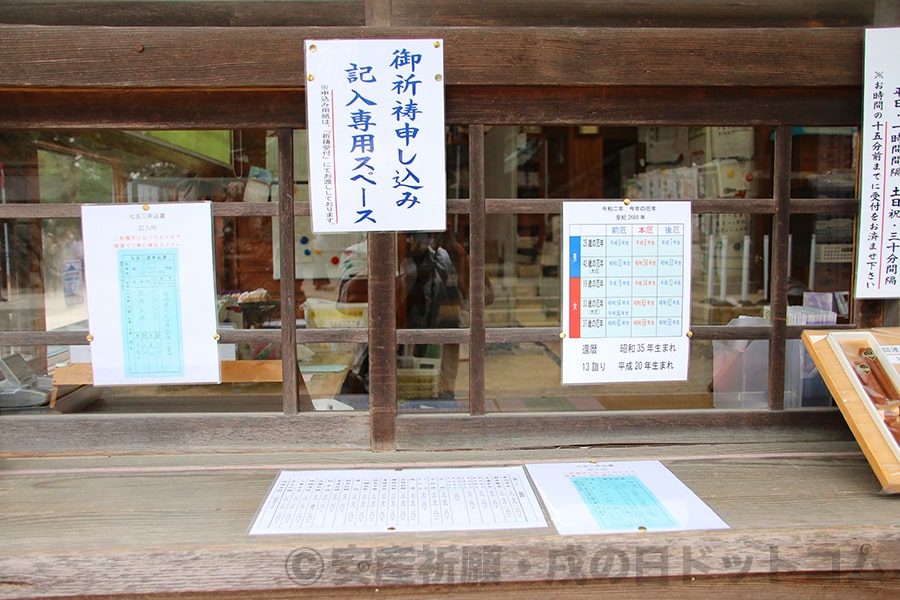 こちらの御祈祷受付で安産祈願の御祈祷を申し込むわけですが、受付窓口にて御祈祷の申込用紙が手渡されるので、その申込用紙に記入をし(窓口すぐ横に↑写真のような記入スペース・台があるので)、記入後に受付窓口にて申し込みを行います。