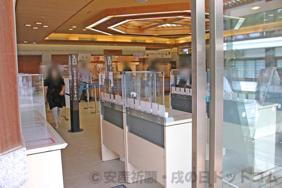 ※寒川神社 客殿内の申込用紙記入所と奥にある御祈願受付窓口の様子|画像提供:安産祈願・戌の日ドットコム