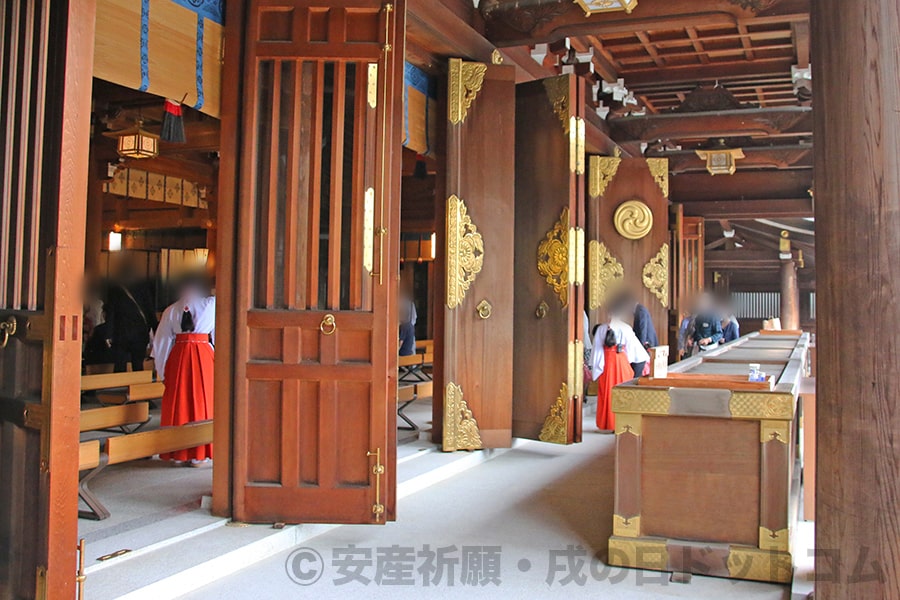 さていよいよ御社殿(拝殿・本殿)での御祈祷を受ける時間と順番が来たら、御社殿に上がる(昇殿する)ように案内があります。