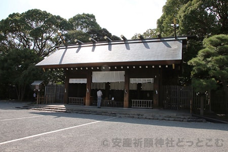 同神宮の拝殿、この奥に本殿があります。お社の造りが神宮のそれですね。神明檜造(しんめいひのきづくり)という造りで大変厳かな造りのお社です。