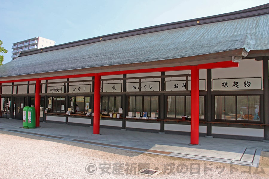 ちなみに筥崎宮の祈願受付は、筥崎宮の本殿・拝殿前にある楼門、その楼門手前左手に↑写真のような社務所あり、この社務所に授与所などと並んである祈願受付の受付窓口にて安産祈願の御祈祷の申し込みができます。