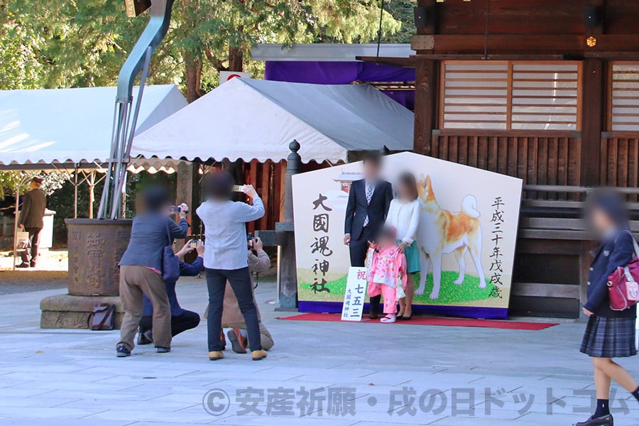大國魂神社 拝殿横の大絵馬とそこで記念撮影の様子