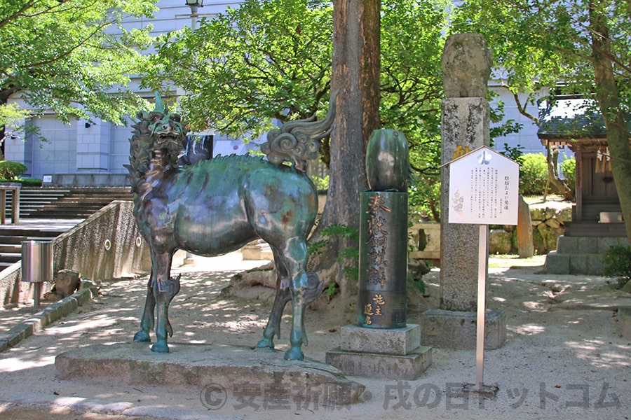 太宰府天満宮の境内には、さきほどの撫で牛の他、写真にある麒麟(左)や鷽(うそ:真ん中)など、神社に関係の深い動物・生き物の銅像も設置されています。